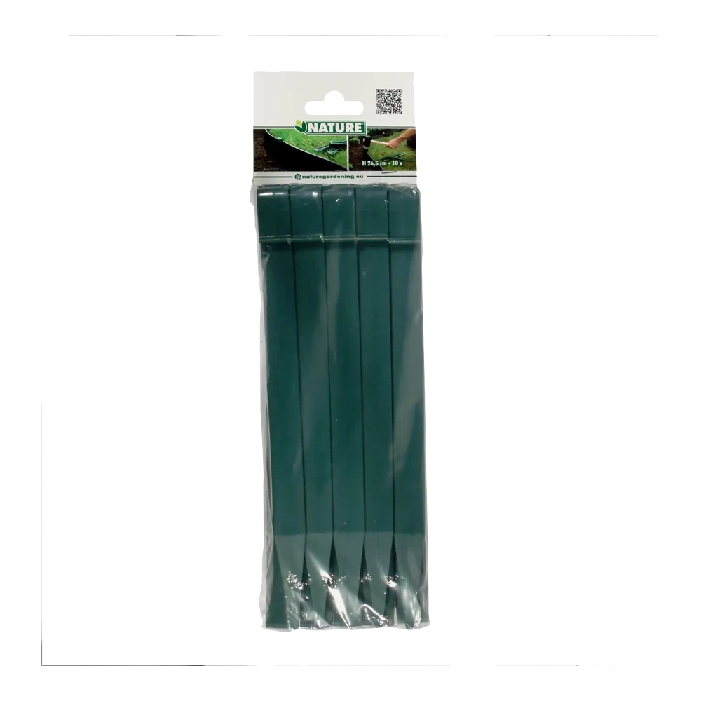 De groene grondpennen zijn gemaakt van gerecycleerd polyethyleen. Ze zijn 26,7 cm hoog. De ankers worden gebruikt om tuinborders vast te zetten en de randen van jouw gazon te vrijwaren.